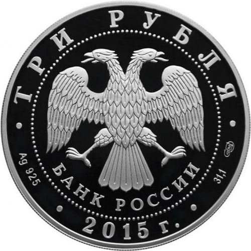 Аверсы монет: в центре – эмблема Банка России (двуглавый орёл с опущенными крыльями, под ним – надпись полукругом "БАНК РОССИИ"), обрамленная кругом из точек и надписями по кругу – вверху: "ТРИ РУБЛЯ", внизу: слева – обозначения драгоценного металла и пробы сплава, в центре – год выпуска "2015 г.", справа – содержание химически чистого металла и товарный знак монетного двора.