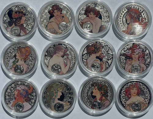 Серебряные, памятные монеты из серии "А. Муха Знаки Зодиака (состоящий из 12 монет) , выпущены Филателическим и нумизматическим Бюро Ниуэ , являющимся официальным эмиссионным органом Правительства Острова Ниуэ , в связи со 150 годовщиной со дня рождения этого великого художника.