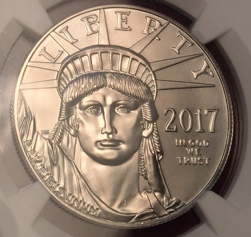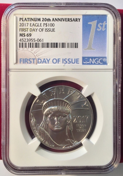 Платиновая монета США «Юбилейный Американский Орел» 2017 года выпуска посвящена 20-летнему юбилею монетной платиновой программе «Американский Орел». На этой монете изображен портрет Статуи Свободы. В слабе авторитетной американской грейдинговой компании NGC с грейдом MS69 FIRST DAY OF ISSUE (Первый день выпуска монеты).