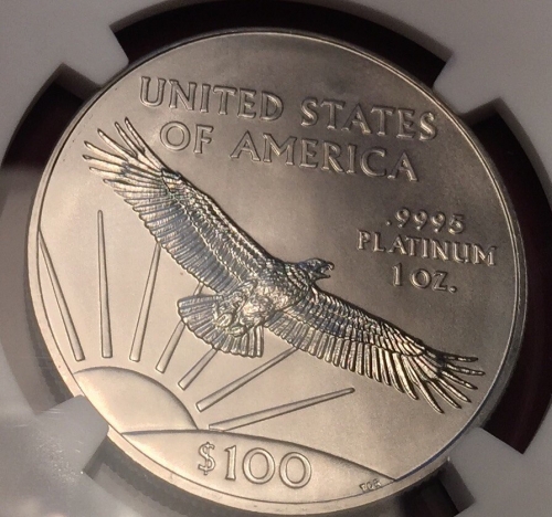 Аверс: Изображен орел в полете на фоне восходящего из-за линии горизонта солнца и его лучей. Сверху стоит надпись в две строки: «UNITED STATES OF AMERICA» (Соединенные Штаты Америки). Справа сверху от орла находятся следующие обозначения в три строки: «.9995 PLATINUM 1 OZ.» (проба 0.9995, платина, 1 унция). На стилизованном изображении земли внизу стоит информация о номинале: «$100» (100 долларов).