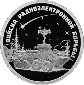 рельефное изображение комплекса радиоэлектронной борьбы «Инфауна» на фоне выполненных в технике лазерного матирования изображений ночного неба и леса; вверху по окружности – рельефная надпись «ВОЙСКА РАДИОЭЛЕКТРОННОЙ БОРЬБЫ».