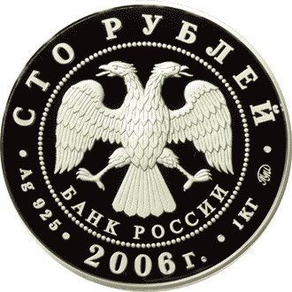 в центре диска – эмблема Банка России (двуглавый орел с опущенными крыльями, под ним надпись полукругом «БАНК РОССИИ»), обрамленная кругом из точек и надписями по кругу: вверху – «СТО РУБЛЕЙ», внизу – «2006 г.», слева – обозначение металла, проба сплава, справа – содержание драгоценного металла в чистоте и товарный знак монетного двора.