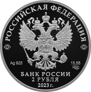 рельефное изображение Государственного герба Российской Федерации, над ним вдоль канта – надпись полукругом: «РОССИЙСКАЯ ФЕДЕРАЦИЯ», обрамленная с обеих сторон сдвоенными ромбами, под гербом: слева – обозначения драгоценного металла и пробы сплава, справа – содержание химически чистого металла и товарный знак монетного двора, внизу в центре в три строки – надпись: «БАНК РОССИИ», номинал монеты: «2 РУБЛЯ», год выпуска: «2023 г.».