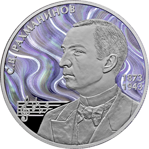 рельефные изображения портрета С.В. Рахманинова и нотного стана на стилизованном фоне, представляющем собой композицию волнистых радужных линий с эффектом интерференции света; вверху слева – рельефная надпись: «С.В. РАХМАНИНОВ», справа в две строки – годы жизни композитора: «1873» и «1943».