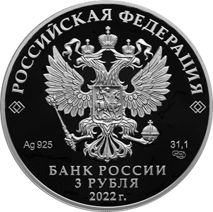 рельефное изображение Государственного герба Российской Федерации, над ним вдоль канта — надпись полукругом: «РОССИЙСКАЯ ФЕДЕРАЦИЯ», обрамленная с обеих сторон сдвоенными ромбами, внизу под гербом: слева — обозначения драгоценного металла и пробы сплава, справа — содержание химически чистого металла и товарный знак монетного двора, внизу в центре в три строки — надпись: «БАНК РОССИИ», номинал монеты: «3 РУБЛЯ», год выпуска: «2022 г.».