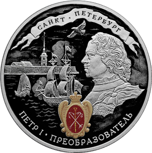 рельефные изображения портрета Петра I в профиль, Петропавловской крепости, кораблей, идущих по Неве, и ленты с надписью «САНКТ-ПЕТЕРБУРГ», а также выполненное в рельефе с цветным покрытием одно из первых изображений герба Санкт-Петербурга; внизу вдоль канта — рельефная надпись: «ПЕТР I • ПРЕОБРАЗОВАТЕЛЬ».