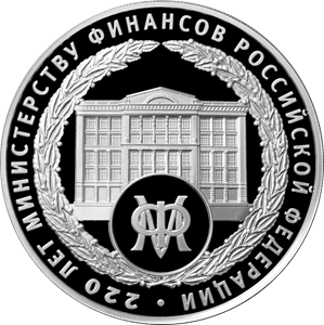 в обрамлении лаврового венка – изображения здания Министерства финансов Российской Федерации и, на переднем плане в круге, фрагмента эмблемы Министерства; по окружности – надпись: «220 ЛЕТ МИНИСТЕРСТВУ ФИНАНСОВ РОССИЙСКОЙ ФЕДЕРАЦИИ». Все элементы художественного оформления выполнены в рельефе.