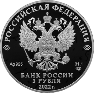 на зеркальном поле диска — рельефное изображение Государственного герба Российской Федерации, над ним вдоль канта — надпись полукругом: «РОССИЙСКАЯ ФЕДЕРАЦИЯ», обрамленная с обеих сторон сдвоенными ромбами, внизу под гербом: слева — обозначения драгоценного металла и пробы сплава, справа — содержание химически чистого металла и товарный знак монетного двора, внизу в центре в три строки — надпись: «БАНК РОССИИ», номинал монеты: «3 РУБЛЯ», год выпуска: «2022 г.».