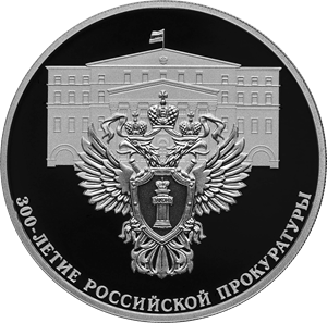 на зеркальном поле диска — рельефное изображение эмблемы прокуратуры Российской Федерации на фоне изображения здания прокуратуры; внизу вдоль канта — надпись: