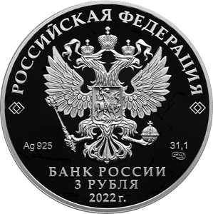 рельефное изображение Государственного герба Российской Федерации, над ним вдоль канта — надпись полукругом: «РОССИЙСКАЯ ФЕДЕРАЦИЯ», обрамленная с обеих сторон сдвоенными ромбами, под гербом: слева — обозначения драгоценного металла и пробы сплава, справа — содержание химически чистого металла и товарный знак монетного двора, внизу в центре в три строки — надпись: «БАНК РОССИИ», номинал монеты: «3 РУБЛЯ», год выпуска: «2022 г.».