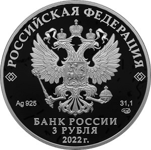 рельефное изображение Государственного герба Российской Федерации, над ним вдоль канта — надпись полукругом: «РОССИЙСКАЯ ФЕДЕРАЦИЯ», обрамленная с обеих сторон сдвоенными ромбами, внизу под гербом: слева — обозначения драгоценного металла и пробы сплава, справа — содержание химически чистого металла и товарный знак монетного двора, внизу в центре в три строки — надпись: «БАНК РОССИИ», номинал монеты: «3 РУБЛЯ», год выпуска: «2022 г.».