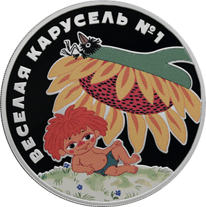 выполненное в цвете изображение сцены из мультипликационного журнала «Веселая карусель № 1»; слева вверху – рельефная надпись: «ВЕСЕЛАЯ КАРУСЕЛЬ № 1».