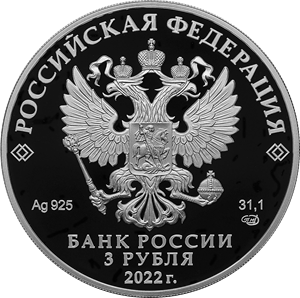 на зеркальном поле диска — рельефное изображение Государственного герба Российской Федерации, над ним вдоль канта — надпись полукругом: «РОССИЙСКАЯ ФЕДЕРАЦИЯ», обрамленная с обеих сторон сдвоенными ромбами, внизу под гербом: слева — обозначения драгоценного металла и пробы сплава, справа — содержание химически чистого металла и товарный знак монетного двора, внизу в центре в три строки — надпись: «БАНК РОССИИ», номинал монеты: «3 РУБЛЯ», год: «2022 г.».