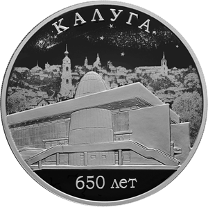 на зеркальном поле диска — рельефное изображение здания Государственного музея истории космонавтики им. К.Э. Циолковского на фоне изображений панорамы города Калуги и звездного неба; имеются надписи, вверху вдоль канта: «КАЛУГА», внизу: «650 ЛЕТ».