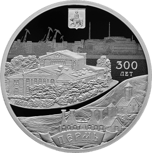 рельефные изображения: вверху – герба Перми, в центре – Пермского театра оперы и балета, внизу – старинного Егошихинского завода и ленты с надписью «ПЕРМЬ» – на фоне выполненного в технике лазерного матирования вида на реку, портовые краны и промышленные сооружения; справа – рельефная надпись в две строки: «300 ЛЕТ».