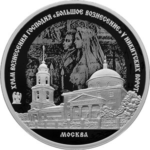 рельефное изображение храма Вознесения Господня «Большое Вознесение» на фоне выполненной в технике лазерного матирования сцены венчания А.С. Пушкина и Н.Н. Гончаровой; слева – миниатюрная фигура ангела, выполненная в рельефе; рельефные надписи: вверху по окружности – «ХРАМ ВОЗНЕСЕНИЯ ГОСПОДНЯ «БОЛЬШОЕ ВОЗНЕСЕНИЕ» У НИКИТСКИХ ВОРОТ», внизу – «МОСКВА».