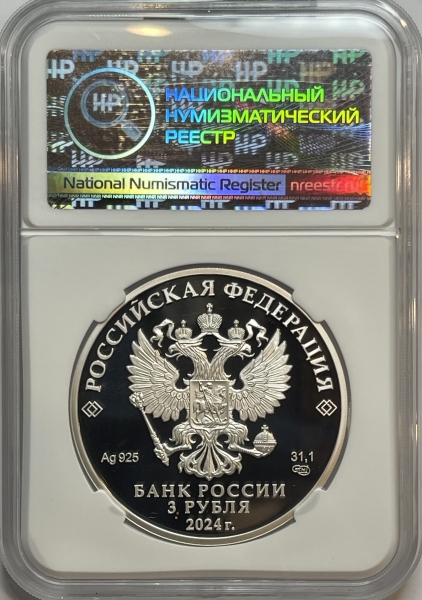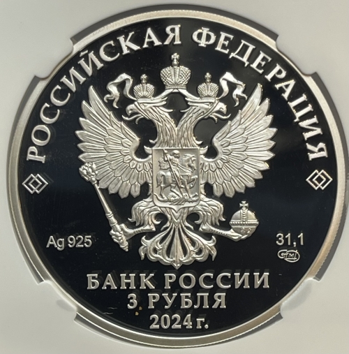 рельефное изображение Государственного герба Российской Федерации, над ним вдоль канта – надпись полукругом «РОССИЙСКАЯ ФЕДЕРАЦИЯ», обрамленная с обеих сторон сдвоенными ромбами, под гербом слева – обозначения драгоценного металла и пробы сплава, справа – содержание химически чистого металла и товарный знак монетного двора, внизу в центре в три строки – надпись «БАНК РОССИИ», номинал монеты «3 РУБЛЯ», год выпуска «2024 г.».