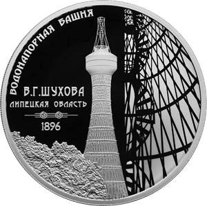 выполненное в рельефе и в технике лазерного матирования изображение водонапорной башни, возвышающейся над кронами деревьев, справа – выполненное в технике лазерного матирования изображение конструкций башни; слева имеются рельефные надписи: вверху по окружности – «ВОДОНАПОРНАЯ БАШНЯ», ниже в две строки – «В.Г. ШУХОВА» и «ЛИПЕЦКАЯ ОБЛАСТЬ», а также дата «1896», отделенная декоративным элементом.