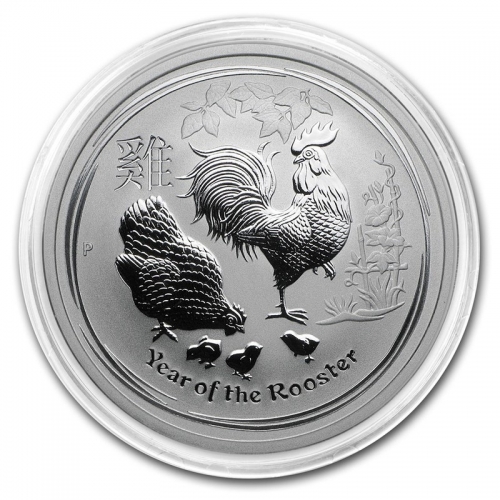 На аверсе серебряной монеты "Год Петуха" изображен петух с курицей и цыплятами, сверху - китайский иероглиф, снизу - надпись на английском языке - "Year of the Rooster" (Год Петуха).