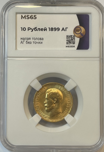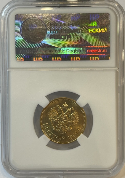 В центре изображен Малый Государственный Герб Российской империи - двуглавый орёл, головы которого увенчаны двумя коронами, третья, большая корона над ними. Все они соединены орденской лентой ордена Св. Апостола Андрея Первозванного. На груди орла расположен Московский герб, в щите изображен Георгий Победоносец с копьем поражающий дракона. Вокруг щита цепь ордена Св. Апостола Андрея Первозванного. На крыльях изображены гербы: Царства Казанского, Польского, Херсонеса Таврического, Астраханского, Сибирского, Грузинского, герб соединенных княжеств Киевского, Новгородского и Владимирского и герб Великого Княжества Финляндского — по 4 на каждое крыло. В правой лапе орла – скипетр, в левой – держава. Под ним слева направо изображены: номинал - надпись «10 РУБЛЕЙ» и дата выпуска «1899 Г.». По окружности канта имеются рельефные элементы, выполненные в виде зубцов.