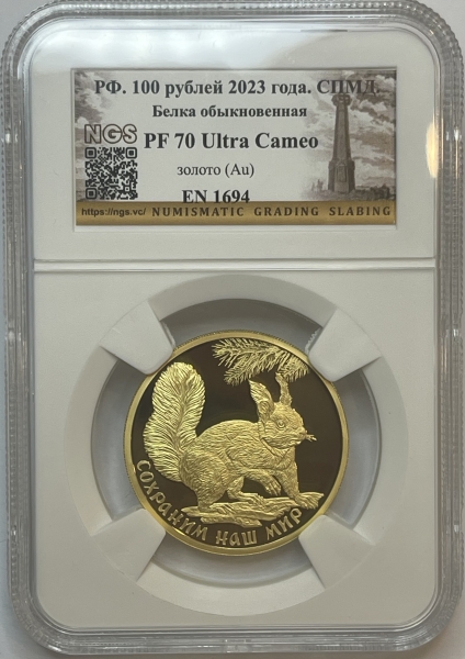 По центру изображена вправо белка на ветке, над ней сосновая ветвь. Снизу вдоль канта надпись «СОХРАНИМ НАШ МИР».