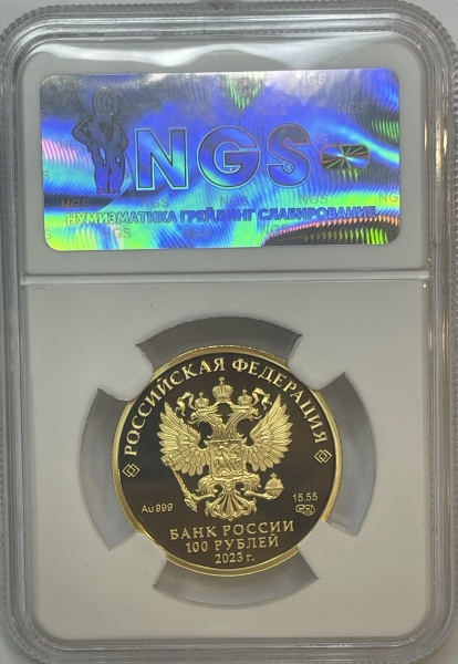 По центру изображен Государственный герб Российской Федерации, сверху вдоль канта – название страны «РОССИЙСКАЯ ФЕДЕРАЦИЯ», обрамленное с обеих сторон сдвоенными ромбами. Снизу горизонтально надпись в три строки – «БАНК РОССИИ, 100 РУБЛЕЙ, 2023 г.». Под гербом: слева – обозначения драгоценного металла и пробы сплава «Au999», справа – содержание химически чистого металла и товарный знак монетного двора «15,55 СПМД».