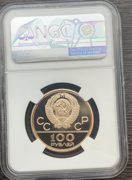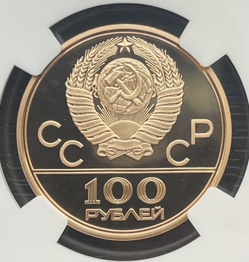 Сверху герб СССР с 15 витками ленты, слева от него буквы «СС», справа «СР», ниже двойная черта, под ней обозначение достоинства монеты цифра «100» и ниже слово «РУБЛЕЙ».