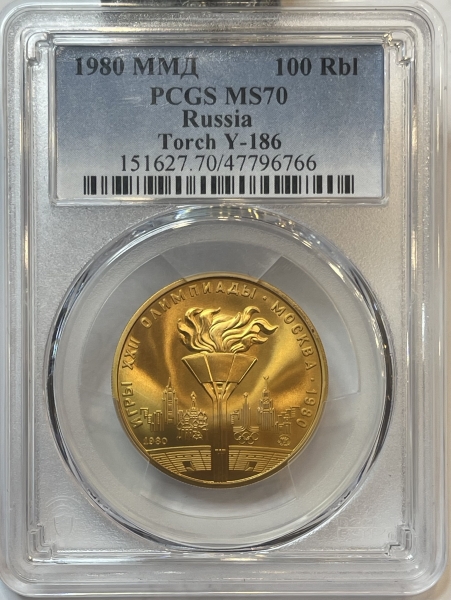 Слева и сверху вдоль канта слова «ИГРЫ XXII ОЛИМПИАДЫ», справа разделенные точкой слово «МОСКВА» и год проведения XXII Олимпиады «1980», в середине олимпийский огонь на стадионе им. В.И. Ленина, справа от чаши с олимпийским огнем эмблема XXII Олимпийских игр, на заднем плане панорама Москвы, ниже слева год выпуска монеты «1980», справа монограмма монетного двора «ММД».