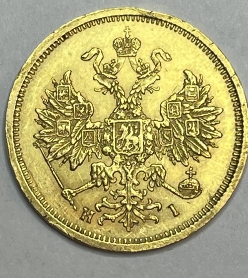 В центре указан номинал «5», ограниченный с обеих сторон шестиконечными звездочками. Под цифрой номинала — слово "РУБЛЕЙ". Ниже, расположен декоративный разделитель в виде двух разнонаправленных фигурных линий и небольшой выпуклой точки между ними. Под разделителем — дата выпуска монеты «1877». Под цифрой даты — обозначение монетного двора «С.П.Б.». Центральная часть отделена от остального изображения, окружностью в виде точек. За окружностью круговая надпись: «ЧИСТОГО ЗОЛОТА 1 ЗОЛОТНИК 39 ДОЛЕЙ», разделенная сверху цветочной розеткой. По окружности канта имеются рельефные элементы, выполненные в виде зубцов.