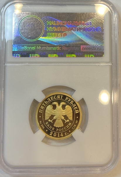 В центре диска – эмблема Банка России (двуглавый орел с опущенными крыльями, под ним надпись полукругом "БАНК РОССИИ"), обрамленная кругом из точек и надписями по кругу – вверху: "ПЯТЬДЕСЯТ РУБЛЕЙ", внизу: слева – обозначения драгоценного металла и пробы сплава, в центре – дата выпуска "2014 г.", справа - содержание химически чистого металла и товарный знак монетного двора.