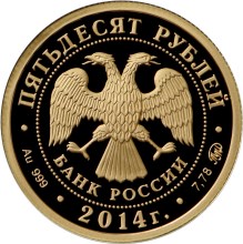 в центре диска – эмблема Банка России (двуглавый орел с опущенными крыльями, под ним надпись полукругом "БАНК РОССИИ"), обрамленная кругом из точек и надписями по кругу – вверху: "ПЯТЬДЕСЯТ РУБЛЕЙ", внизу: слева – обозначения драгоценного металла и пробы сплава, в центре – дата выпуска "2014 г.", справа - содержание химически чистого металла и товарный знак монетного двора.