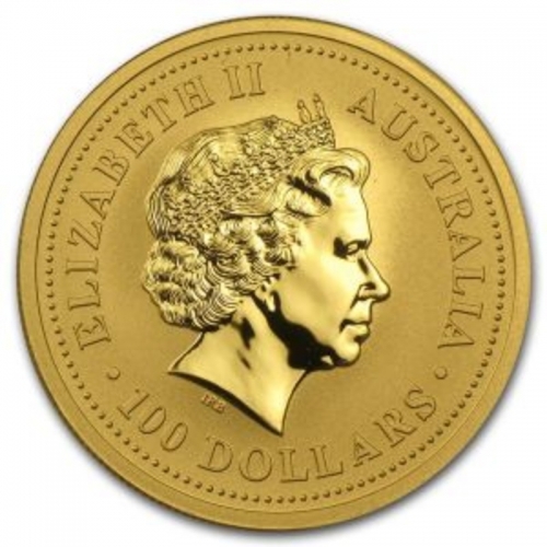 На аверсе золотой монеты Австралии "Лунный календарь I - Год Собаки" - профиль королевы Великобритании Елизаветы II. Сверху надписи на английском: "Elizabeth II" и "Australia". Снизу - проба золота и вес монеты (1 тройская унция золота 9999 пробы), год выпуска монеты (2006) и номинал монеты (100 австралийских долларов).