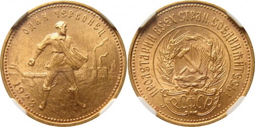 Одновременно с выпуском бумажных червонцев, в октябре 1922 года было принято решение о выпуске золотых червонцев в виде монет. По своим весовым характеристикам (8,6 г, 900 проба) и размерам червонец полностью соответствовал дореволюционной монете в 10 рублей. Автором рисунка стал главный медальер монетного двора А. Ф. Васютинский (также автор окончательного варианта ордена Ленина и первого значка ГТО). На аверсе монеты был изображён герб РСФСР; на реверсе — крестьянин-сеятель, выполненный по скульптуре И. Д. Шадра (натурщиками были два крестьянина деревни Праговая Шадринского уезда Перфилий Петрович Калганов и Киприян Кириллович Авдеев), ныне находящейся в Третьяковской галерее. Монета была отчеканена на Петроградском монетном дворе в 1923 году тиражом 2 751 000 экземпляров.[3]