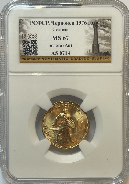 Изображение крестьянина-сеятеля на фоне плуга, восходящего солнца и заводов; по краю монеты точки, вверху надпись - «ОДИН ЧЕРВОНЕЦ», внизу слева — год выпуска - 1976.