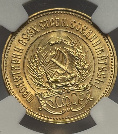 Герб РСФСР, окруженный венком из колосьев, и щит с изображением на нем серпа и молота на фоне солнечных лучей; по краю монеты точки вдоль них надписи: сверху - «ПРОЛЕТАРИИ ВСЕХ СТРАН, СОЕДИНЯЙТЕСЬ!», внизу под гербом - «Р. С. Ф. С. Р.».