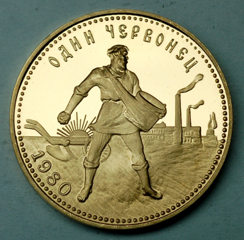 На реверсе изображен крестьянин-сеятель на фоне плуга, восходящего солнца и заводов. По окружности — надписи, обрамленные кругом из точек: вверху — ОДИН ЧЕРВОНЕЦ, внизу слева — год выпуска.