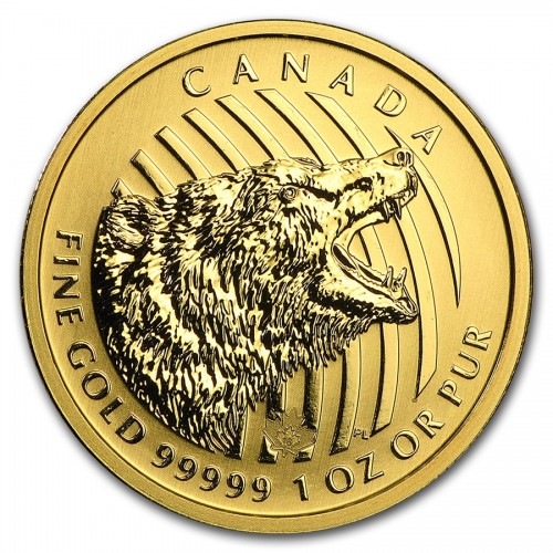 На реверсе золотой монеты "Рычащий Гризли" изображена голова медведя с открытой пастью. На заднем плане с помощью дуговых параллельных линий показан процесс рычания хищника. В верхней части монеты полукругом выгравирована надпись – «CANADA». Внизу есть надписи – «FINE GOLD», «99999», «1 OZ», «OR PUR». Справа указаны инициалы дизайнера – «РL».