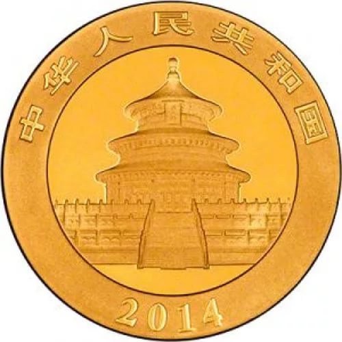 На аверсе монеты Китайская Панда изображение Храма Неба. Сверху надпись, которая переводится как Китайская Народная Республика, внизу год выпуска (2014).